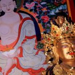 法身的三种法衣是上衣(袈裟)、祖衣(重复衣)、下衣(五衣)。 受用身佩戴的八种珍宝装饰是宝冠和珍宝耳环、珍宝项链、珍宝臂 镯、珍宝璎珞、双股珍宝项链、珍宝手镯、绢丝腰带或腰带垂穗等, 二衣是肩帔和禅裙。